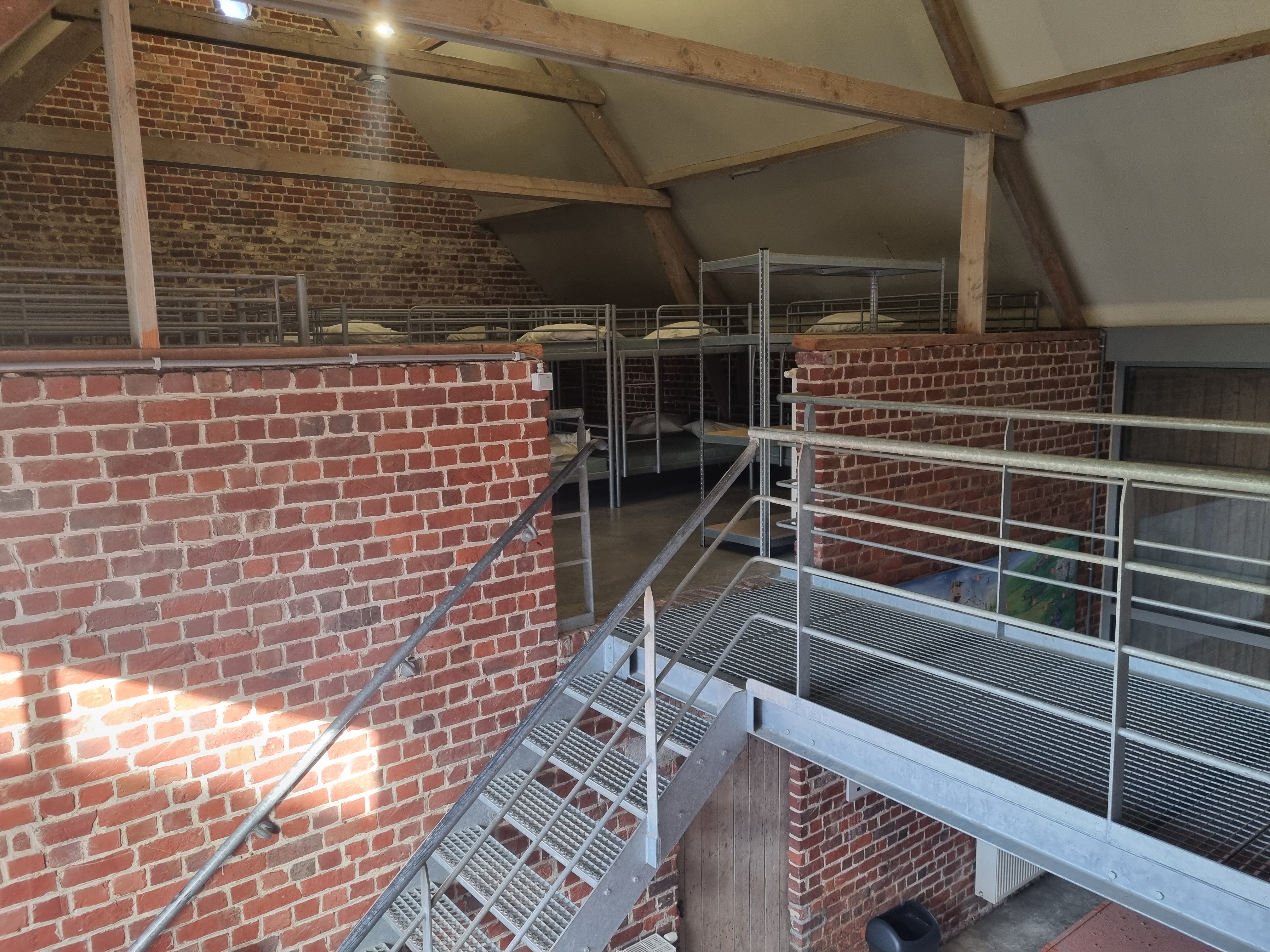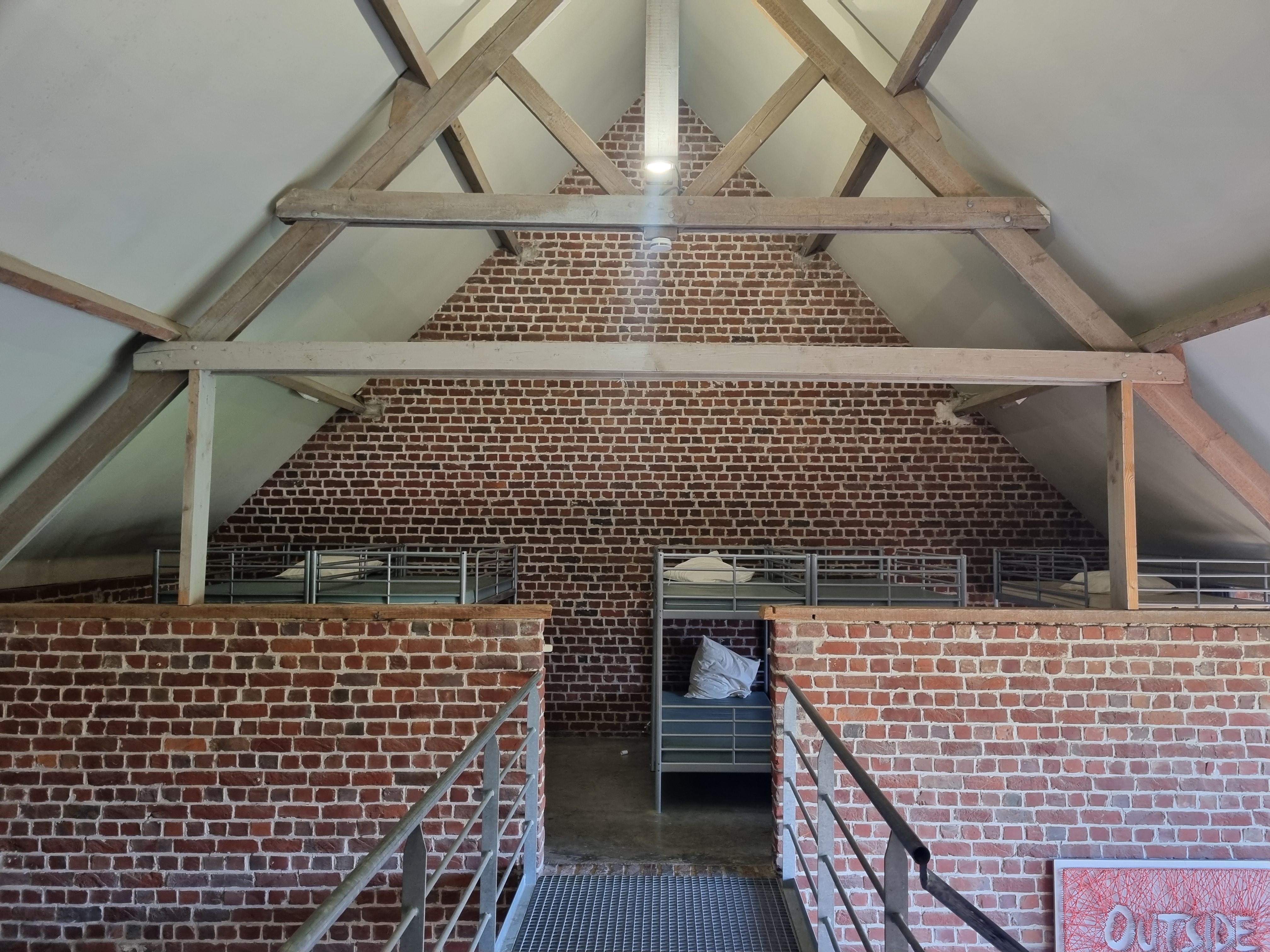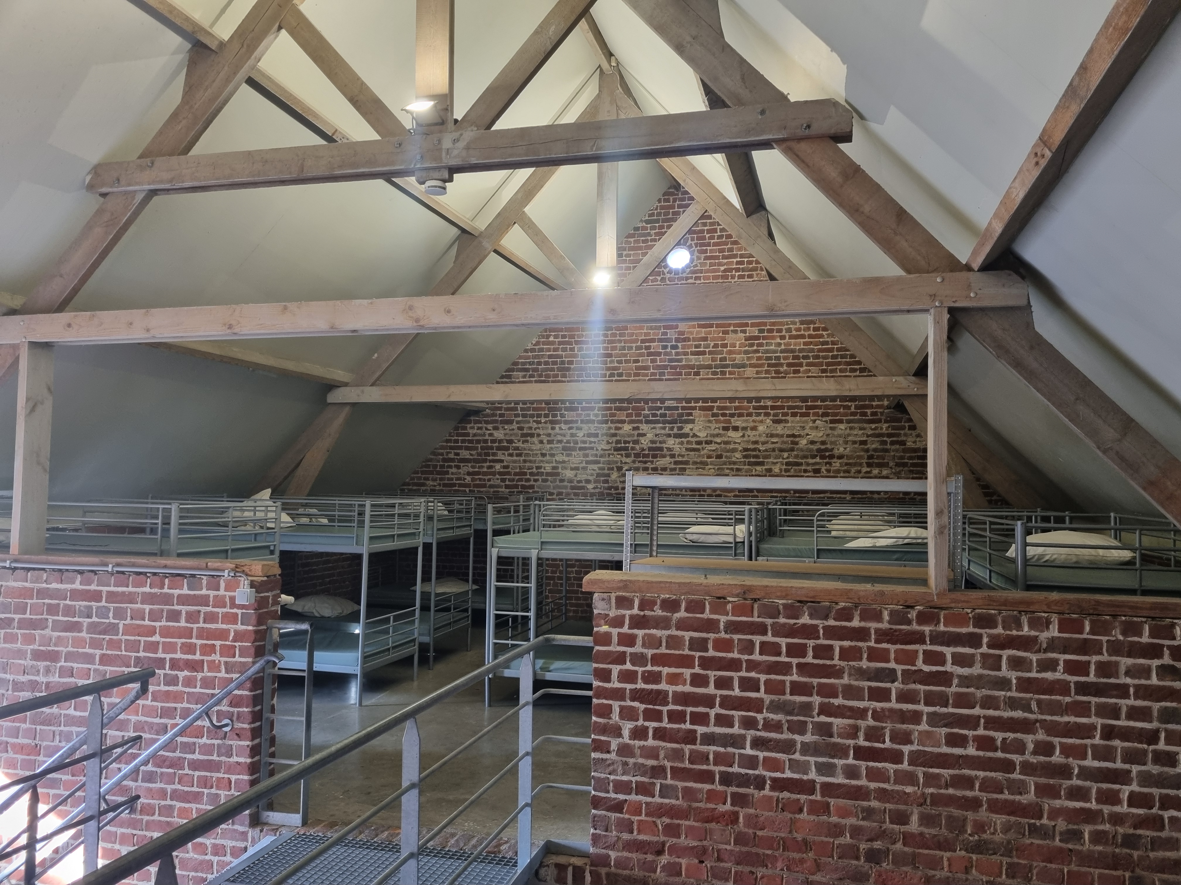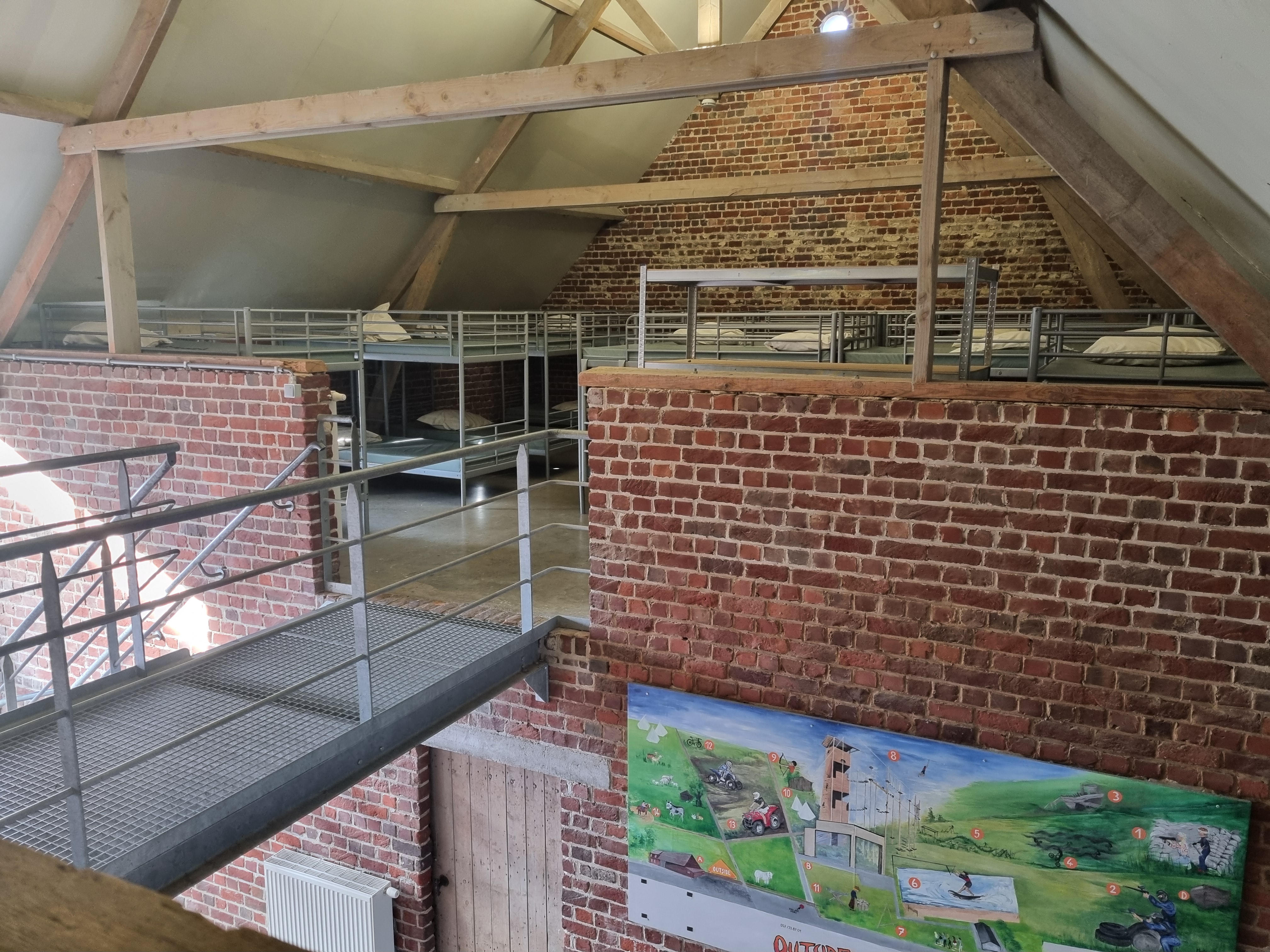 Naast deze ruimte is er een keukentje en een bar met ruime toog. De hoeve beschikt over twee sanitaire blokken met in totaal 4 toiletten, 8 lavabo’s en 7 douches. De slaapzaal bevindt zich op het eerste verdiep en bevat 16 stapelbedden (plaats voor 32 personen). Voor sportclubs die een aparte kamer wensen voor hun trainers/afgevaardigden is er nog een aparte slaapkamer aanwezig met 2 stapelbedden + een extra badkamer met douche en toilet.